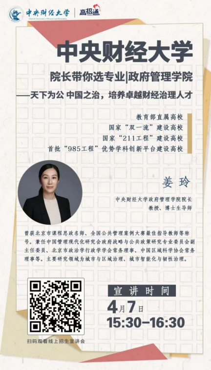 4月7日,姜玲院长参加学校本科招生办主办的“龙马讲堂——院长带你选专业”栏目,以“天下为公 中国之治,培养卓越财经治理人才”为题,面向全国2023年高考考生和家长作专题讲座。