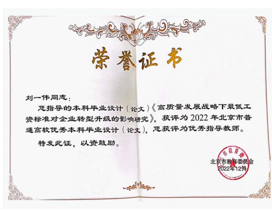 2022年11月3日,北京市教育委员会发布关于公布2022年北京市普通高等学校优秀本科生毕业设计(论文)名单的通知,kaiyun登录官网刘一伟老师指导的本科毕业设计(论文)《高质量发展战略下最低工资标准对企业转型升级的影响研究》获评为2022年北京市普通高校优秀本科毕业设计(论文),刘一伟老师获评为优秀指导教师。