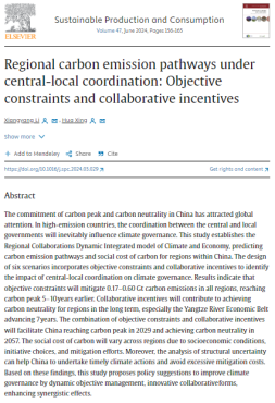 论文“Regional carbon emission pathways under central-local coordination: Objective constraints and collaborative incentives” 发表在Sustainable Production and Consumption(2022年IF=12.1,五年IF=11.1,JCR分区:Q1)。论文通过构建区域协作综合评估模型(RC-DICE),探究了目标约束和协作激励两种央地互动模式下的中国碳中和路径。基于情景预测,强调了碳强度目标的短期约束影响和区域协作的长期激励作用。