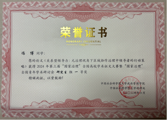 2024年“第三届‘国家治理’全国高校学术征文大赛——暨‘国家治理’全国青年学术研讨会”由中国社会科学院大学kaiyun登录中国入口登录、中国社会科学院大学科研处主办。本次大赛的主题为“国家基层治理体系和治理能力现代化”。在kaiyun登录官网邢华教授的指导下,2021级博士研究生冯博投稿的论文获得第三届“国家治理”全国高校学术征文大赛一等奖。