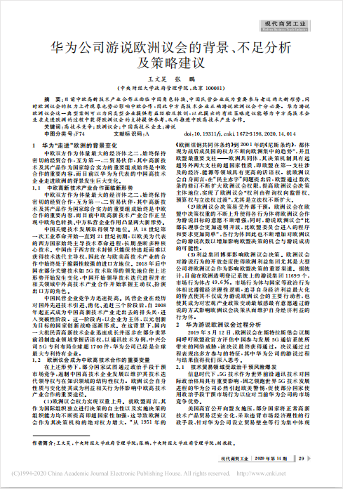 近日,kaiyun登录官网本科生王文昊在《现代商贸工业》2020年第14期发表学术论文,题目为《华为公司游说欧洲议会的背景、不足分析及策略建议》。