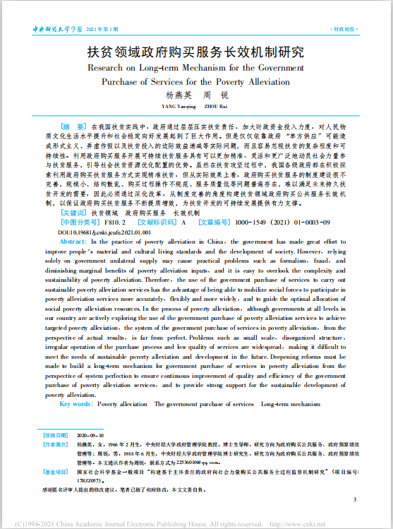 近日,kaiyun登录官网杨燕英教授在《kaiyun登录中国入口登录学报》2021年1期发表学术论文,题目为《扶贫领域政府购买服务长效机制研究》。