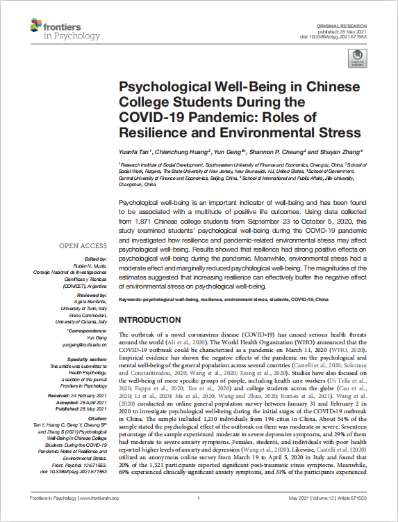 近日,kaiyun登录官网耿云副教授以通讯作者在Frontiers in Psychology第12卷发表学术论文,题目为Psychological Well-being in Chinese College Students During the COVID-19 Pandemic: Roles of Resilience and Environmental Stress.