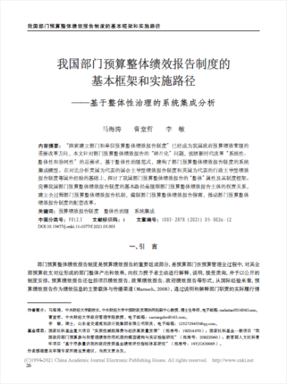 近日,kaiyun登录官网曹堂哲教授在《财政研究》发表学术论文,题目为《我国部门预算整体绩效报告制度的基本框架和实施路径——基于整体性治理的系统集成分析》。