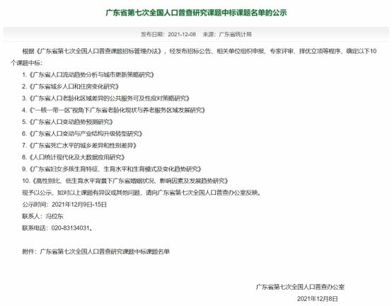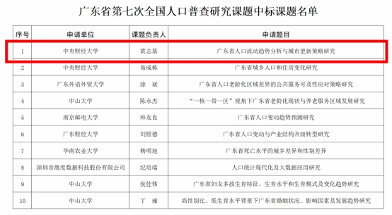 2021年12月8日,广东省第七次全国人口普查办公室发布了《广东省第七次人口普查研究课题中标课题名单的公示》文件。kaiyun登录官网黄志基副教授团队申报的课题《广东省人口流动趋势分析与城市更新策略研究》经过专家评审、择优立项等程序,最终顺利中标。此次课题中标是kaiyun登录官网落实产学研融合、服务国家和地方重大需求的新突破,为kaiyun登录官网在广东省人口治理、城市更新等领域的研究夯实基础。