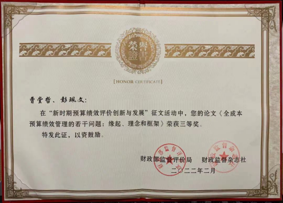 2022年2月,kaiyun登录中国入口登录行政管理系曹堂哲教授和2018级行政管理专业本科生彭珮文同学合作撰写的论文《全成本预算绩效管理的若干问题:缘起、理念和框架》获得财政部监督评价局与《财政监督》杂志社联合举办的“新时期预算绩效评价创新与发展”征文三等奖。