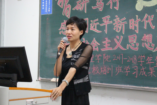 小组汇报展示结束以后,学院党委书记、党校校长吕丽老师对汇报会进了总结。吕书记指出,今天各个小组的学习汇报成果展示主题鲜明,内容丰富,形式多样,成果丰硕,学员们满腔热情,慷慨激昂的重现了五四运动历史画面,马克思穿越现代与青年学子对话,朗诵《共产党宣言》等精彩片段,真正的表现出了当代青年应当有的激情、豪情和血性,这是非常值得欣慰的。同时吕书记也指出了各团队在学习实践文本中出现的主题凝练不足,学习心得少数学员说过程的多,谈体会和心得不够深入等问题。吕书记强调,发展对象和入党积极分子要以此次二级党校结业为新的起点,不断提升自身的党性修养和综合素质,第一是细节决定成败,“天下大事必作于细”;第二是学无止境,必须坚持学习,加强学习,学习理论知识,学习实践经验,学习做人做事的道理;第三点是坚定理想信念,牢记“正气浩然,上善若水”的院训,不为名利徒劳,只为上善正气。