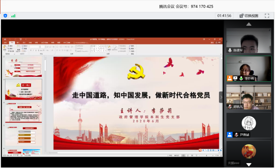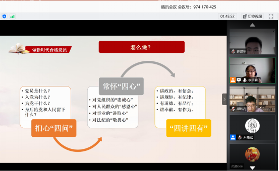 本次主题党日活动分为“红色防火墙”活动和“党课开讲啦”活动两部分。“红色防火墙”活动旨在促进学生党员之间的交流分享,构建学生党员间相互学习自身在配合学校学院常态化疫情防控、在线教学、科学研究、社区治理、垃圾分类等工作中作为党员发挥先锋模范作用的经验和思考。“党课开讲啦”活动以党支部书记李莎莉老师的授课为主体,旨在为学生党员在新形势下认清个人发展与国家发展间的关系,认清作为新时代共产党员的责任与使命。