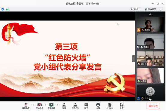 活动伊始,线上会议室奏响国歌,党员们面对屏幕中的国旗肃立,同唱国歌。