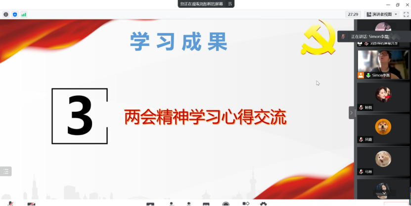 会议由党支部书记李磊主持,在奏唱国歌之后,李磊同志结合两会相关新闻报道视频以及政府工作报告示意图先带领大家学习了今年的政府工作报告,并对报告中要点进行归纳。李磊同志指出,2021年是党和国家历史上具有重要里程碑意义的一年,2022年将召开党的二十大,在这个重要的历史时期召开的全国两会,意义重大,学习贯彻两会精神非常必要。李磊同志分享,取得过去的成绩尤为不易,支撑大家不懈奋进、攻坚克难必然是拥有信念信仰的力量。因为相信,所以能。因为始终坚定“四个自信”,坚信自己的道路、自己的理论、自己的制度、自己的文化,所以能一往无前地走下去。而这次政府工作报告列举的各项成绩,就是用清晰的事实和数据告诉我们中国共产党为什么能、中国特色社会主义为什么好,当然归根到底是因为马克思主义行!