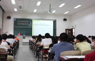 此次新生年级会分两部分进行。会议的第一部分是由负责学院教务工作的宋红美老师为新生们讲解大学学业须知,宋红美老师将学业须知分为选课要求、成绩管理、学位规定、其他事宜四个板块,每一个板块丝丝相扣,条理分明。宋老师从每一要点出发,按着四板块的间架结构对大学学业进行了耐心细致讲解。在讲解过程中,宋老师不时穿插往年学生经历和个人工作经验,使讲解在权威、系统的前提下生动活泼又不失故事性,很好的解答了新生们学业上的疑惑。