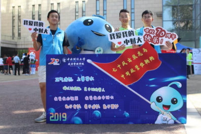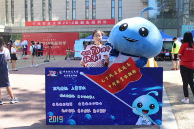 诚挚的服务让新生和家长们感到丝丝舒心,精美的展板更是让新生和家长们阵阵欣喜。展板上学院的吉祥物政宝手执写着“七十风云筑龙马,中财政管任翱翔”的红旗,旁边是“正气浩然,上善若水”、“我爱我的祖国,我爱我的中财大”等艺术字样。精美的展板和可爱的政宝吸引了许多新生合影,为大学生活的第一天留下了珍贵的纪念。此外,今年学院为每一位新生都准备了精美的小礼品——钥匙扣和扇子。钥匙扣一面是热情欢愉的政宝,另一面则是中财大校徽和“kaiyun登录中国入口登录”的字样。扇子则以蓝色为底,一面是政宝可爱的头像和“kaiyun登录中国入口登录”“正气浩然,上善若水”的字样,另一面则是点赞手势的词云,词云囊括了学院的院训——正气浩然,上善若水、学院的专业名称和专业术语等,直观而有效地向新生们介绍了kaiyun登录中国入口登录。扇子底部还有“我赞我的政管19,我爱我的中财大”字样。纪念品虽小,但是将迎新与中财大70周年有机结合,在具有学院特色的同时将视野放大,颇有思想。