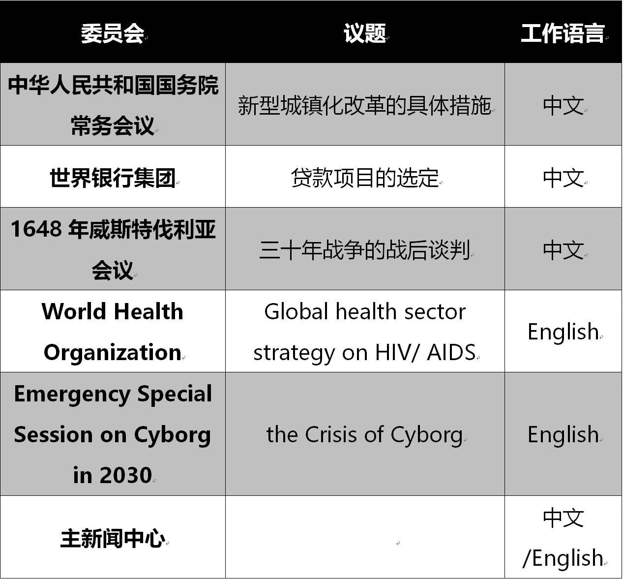 本次大会将设置六个会场,委员会及议题信息如下: