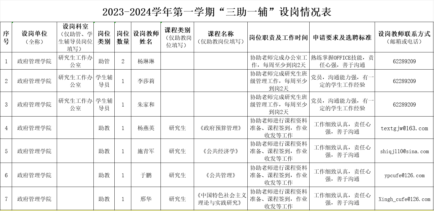 kaiyun登录中国入口登录2023-2024学年第一学期“三助一辅”设岗情况表