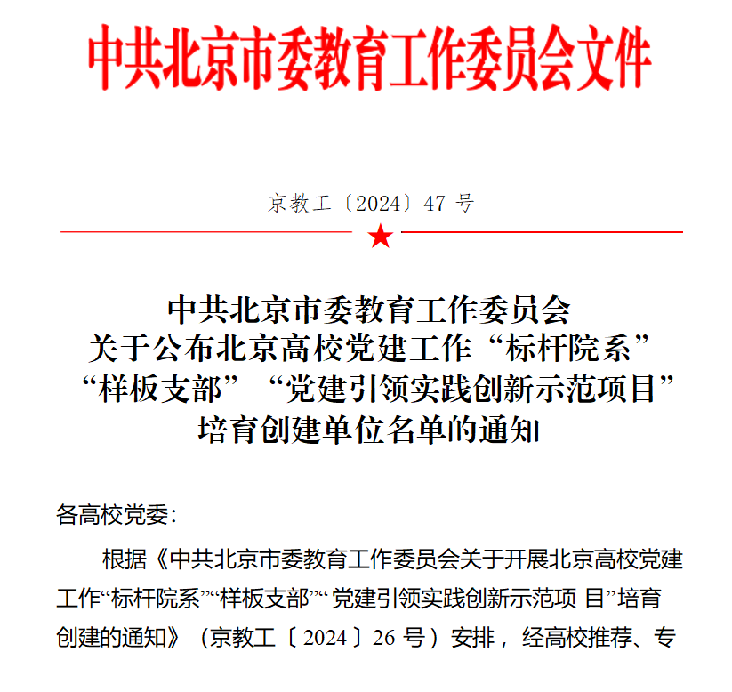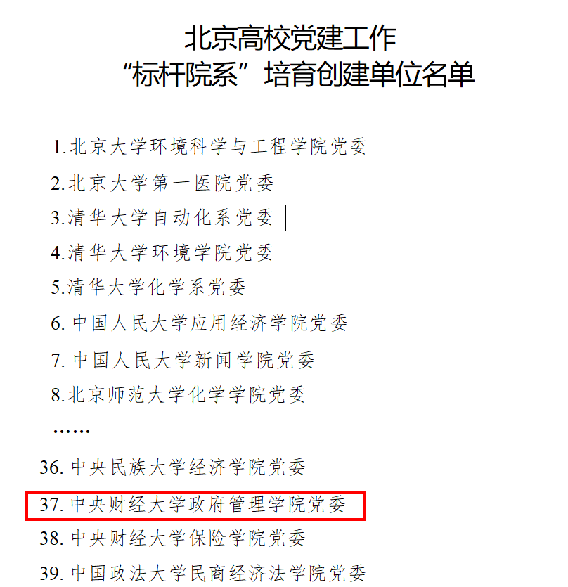 近期,北京市委教育工委公布了北京高校党建工作“标杆院系”“样板支部”“党建引领实践创新示范项目”培育创建单位名单,政府管理学院党委入选北京高校党建工作“标杆院系”创建单位。