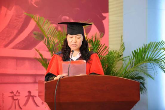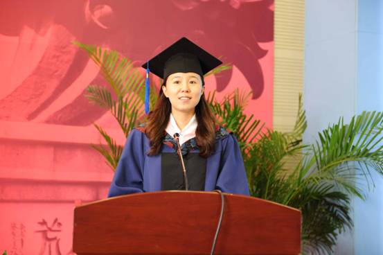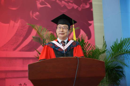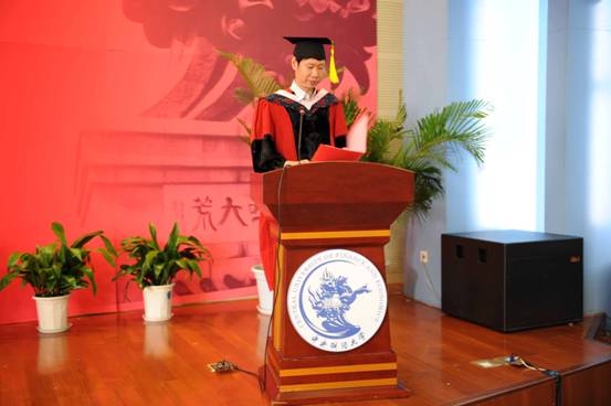 在热烈的掌声中,赵景华院长上台致辞。赵院长首先对同学们顺利完成学业,获得相应的学士学位或硕士学位表示衷心的祝贺。接着,赵院长回顾了学院自建院以来的发展历程,指出学院虽然成立时间不长,但取得了长足的进步,这与每一位老师和同学的辛勤努力是分不开的。赵院长表示,青年人处在价值观形成的关键时期,因此价值观的养成必须像系衣服的扣子一样,第一个扣子就必须系好,否则余下都会扣错。他勉励毕业生要扣好人生的第一粒扣子,并在以后的工作学习中做到有信仰、有理想、有担当。赵院长希望即将走向人生新征程的毕业生们牢记“正气浩然,上善若水”的院训,磨砺知性,持之以恒,面对诱惑,处变不惊,永远铭记自己是“中央政府人”。