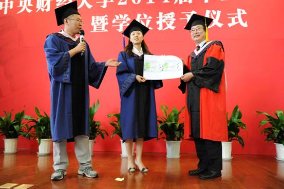 随后,2014届本科生代表、2010级公共事业管理班刘青林及2014届研究生代表、2012级MPA双证班徐子文相继上台发言。他们在对母校、导师、父母家人和同窗同学表达真诚感激之情和献上美好祝福的同时,表示会努力修炼自我,知行合一,用自己的行动诠释“中财人”、“中央政府人”的理想和信念,并“愿中财的记忆不断,愿中财的辉煌不断”。