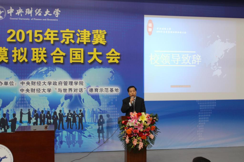 开幕式上,校党委副书记陈明发表讲话,他首先代表学校向本次模联大会的举办表示祝贺,向参加此次比赛的各校代表团表达热烈的欢迎,也向为此次大会的成功举办付出辛勤劳动的老师同学致以由衷的谢意,在深情回忆了十年来活动的举办经历和所取得的巨大成级同时,他希冀模联大会能够高度还原国际热点问题,体现我校财经特色,弘扬与时俱进的联合国理念和责任。