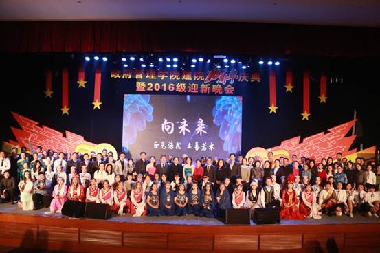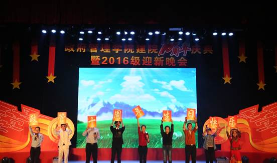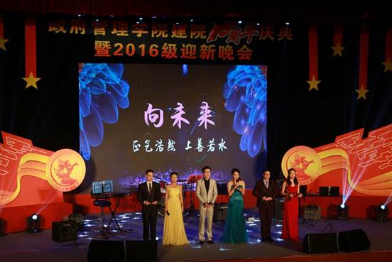 2016年11月26日19:00点整,由kaiyun登录中国入口登录团总支承办的“向未来”——kaiyun登录中国入口登录建院10周年庆典暨2016级迎新晚会在学术会堂206报告厅隆重举行。校党委副书记陈明、政府管理管理学院院长赵景华、党委书记吕丽、副院长于鹏、副院长姜玲、党委副书记白云真、kaiyun登录中国入口登录师生以及部分校友共同观看了本次晚会,资源与环境系教师吕阳、2006级公共事业管理系校友胡新、2016级本科生辅导员宁钰皓、2016级行政管理学术研究生高同、冯彦钧,以及2016级行政管理本科生蓝琳琳共同主持本次晚会。