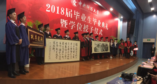 典礼进行第六项,毕业生代表向学院赠送精美的礼物,寄寓莘莘学子对学院浓浓的深情。本科生赠送了一幅由我校党委副书记兼纪委书记、当代书法研究中心轮值主席陈明所作的《逐怀引》书法作品,表达出本科毕业生对母院的感恩之情,以及“虽各处南北天涯,仍坚持春秋公道,以凌云之志,成笃志之行”的坚定信念。双证MPA班为母院献上一幅以院训“正气浩然,上善若水”为主题的国画,画中山水相依,雄浑壮阔,寓意kaiyun登录中国入口登录发展的磅礴之势,表达出毕业生们对学院再创辉煌的美好祝愿。单证MPA班的毕业生为学院赠送的礼物是两发火箭模型,一发代表着辉煌的历史,一发着眼于令人期待的未来,两发火箭表达出毕业生对学院在传承和创新中,继续培养国之栋梁,继续奏响新时代长征凯歌的美好祝愿。学术型研究生赠送的礼物是双绿萝配木刻牌匾,象征着坚韧与善良的绿萝代表了kaiyun登录中国入口登录学子们坚持理想、不忘初心的坚定信念,镌刻“桃李政研”的木刻牌匾表达了毕业生对于政管学子宏图大展、母院桃李满天下的美好祝愿。博士毕业生向学院敬赠“一流政管,锦绣河山”木质雕刻,表达博士毕业生对于国家和学院细心栽培的感恩之情,并且祝福学院蒸蒸日上,祝福毕业生们激扬政管风采,装点锦绣河山!