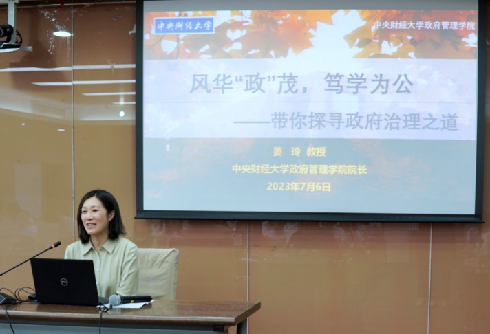 姜玲院长首先致辞,她对各位营员的到来表示热烈欢迎,然后为全体师生开展“风华政茂,笃学为公——带你探寻政府治理之道”主题讲座,就新时代公共管理学科建设与发展、中财kaiyun登录中国入口登录研究生培养特色和就业前景进行了精彩讲解。