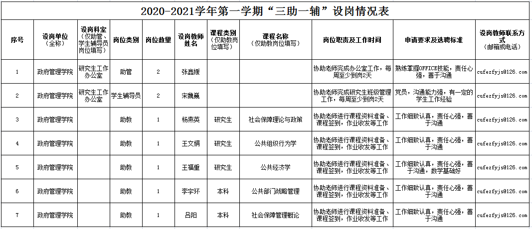 kaiyun登录中国入口登录2020-2021学年第一学期“三助一辅”设岗情况表